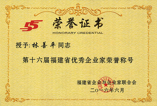為弘揚優(yōu)秀企業(yè)家深化改革、科學管理、與時俱進、勇于創(chuàng)新的開拓精神,激勵廣大企業(yè)家敢為天下先、愛拼才會贏的闖勁,為推動福建省產業(yè)轉型升級和經(jīng)濟持續(xù)健康發(fā)展建功立業(yè),近日,福建省企業(yè)與企業(yè)家聯(lián)合會組織開展了每兩年評選一次的福建省優(yōu)秀企業(yè)家評選工作,并于2016年6月24日決定授予98位企業(yè)經(jīng)營管理者“第十六屆福建省優(yōu)秀企業(yè)家”榮譽稱號,虹潤公司董事長林善平榮獲該榮譽稱號。