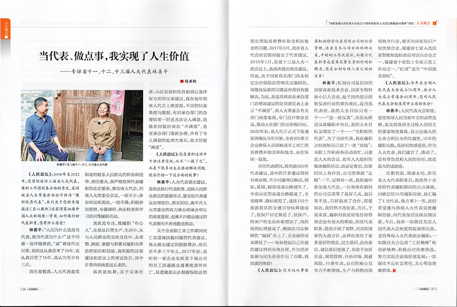 林善平:虹潤公司是民營的國家高新技術(shù)企業(yè)、國家專精特新小巨人企業(yè),處于國內(nèi)顯示控制儀表行業(yè)的領(lǐng)先地位。沒當(dāng)選代表前,我的人生目標只有一個——“造一流儀表”,而自從跨進議政履職平臺后,我的人生目標又增加了一個——“當(dāng)稱職的代表”。為了當(dāng)好代表,我在履職之初就給自己劃了一條“底線”:本職工作和商務(wù)活動再忙,只要是人大的會議、省市人大組織的集體履職活動,就必定參加。如果時間上有沖突,公司的事就“讓路”一下。記得有一次,我到福州參加省人代會,一位客商在順昌的公司總部等了我好幾天,最后等不住,只好取消了合作。即便如此,我仍然不改初衷。而且,于我來說,履職對我更好地經(jīng)營管理企業(yè)有很大的幫助。擔(dān)任代表職務(wù),使我開闊了視野,對黨和國家的大政方針政策、法律法規(guī)有了更多更好的領(lǐng)會,民主意識、法治意識、誠信意識更強了,有助于辦好企業(yè)、規(guī)范管理、開拓市場、規(guī)避風(fēng)險。10多年來,公司的核心競爭力不斷增強,生產(chǎn)與銷售持續(xù)領(lǐng)跑全行業(yè),被評為國家知識產(chǎn)權(quán)優(yōu)勢企業(yè)、福建省七家入選國家智能制造標準應(yīng)用試點企業(yè)之一、福建省十家院士專家示范工作站之一,“虹潤”成為“中國馳名商標”。