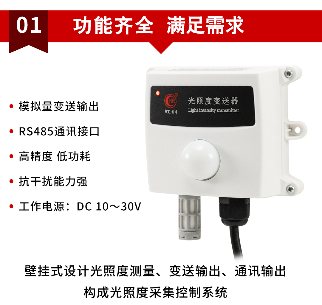 虹潤(rùn)公司是專(zhuān)業(yè)生產(chǎn)環(huán)境監(jiān)測(cè)儀表的國(guó)家專(zhuān)精特新“小巨人”企業(yè)。生產(chǎn)的光照度變送器,具有高精度感光傳感器,響應(yīng)靈敏,準(zhǔn)確度高,低功耗,模擬量變送輸出或RS485通訊等特點(diǎn)。產(chǎn)品獲得一種農(nóng)業(yè)監(jiān)控變送器、一種儀表電源等2項(xiàng)實(shí)用新型專(zhuān)利,主持起草現(xiàn)場(chǎng)設(shè)備集成等5項(xiàng)智能制造國(guó)家標(biāo)準(zhǔn),以及現(xiàn)場(chǎng)設(shè)備工具(FDT)接口規(guī)范、物聯(lián)網(wǎng)總體技術(shù)智能傳感器特性與分類(lèi)等2項(xiàng)國(guó)家標(biāo)準(zhǔn),參與國(guó)際5G標(biāo)準(zhǔn)制定,取得農(nóng)業(yè)監(jiān)測(cè)變送器等3項(xiàng)相關(guān)軟件著作權(quán)。產(chǎn)品廣泛應(yīng)用于溫室大棚、花卉養(yǎng)殖、科研實(shí)驗(yàn)、智能樓宇、戶(hù)外照明等環(huán)境場(chǎng)合對(duì)光照度的檢測(cè)。