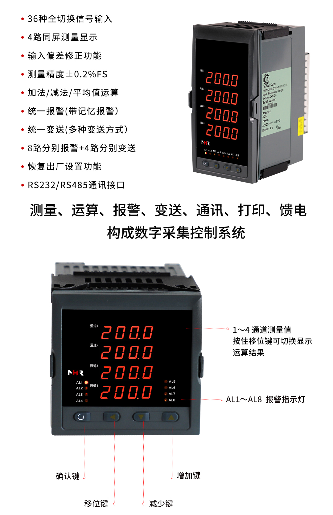 虹潤公司是專業(yè)生產(chǎn)多路溫度巡檢儀的國家專精特新“小巨人”企業(yè),生產(chǎn)的四回路測量顯示控制儀,具有四路同屏顯示,全切換信號輸入,數(shù)學(xué)運算功能,多種輸出類型,RS485/RS232通訊等特點。產(chǎn)品獲得巡回檢測顯示方法及裝置、儀表殼體等2項國家發(fā)明專利,主持起草工業(yè)過程控制系統(tǒng)用模擬輸入兩位或多位輸出儀表、物聯(lián)網(wǎng)智能溫度儀表通用技術(shù)條件等2項國家標(biāo)準(zhǔn),以及通信系統(tǒng)多通道數(shù)據(jù)采集控制終端規(guī)范軍用標(biāo)準(zhǔn),參與國際5G標(biāo)準(zhǔn)制定,取得四回路測量顯示控制儀等3項相關(guān)軟件著作權(quán)。產(chǎn)品廣泛應(yīng)用于電力、石化、冶金、制藥、水處理、機械配套等各種工業(yè)現(xiàn)場。