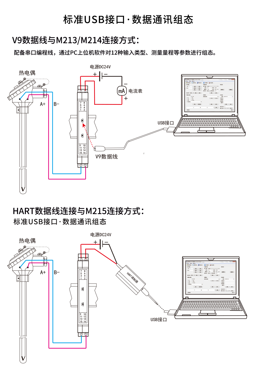 回路供電溫度變送器分為M213智能溫度變送器、M214隔離智能溫度變送器、M215 HART智能溫度變送器,變送器將現(xiàn)場的熱電阻或熱電偶信號經(jīng)過隔離放大處理,轉換為與溫度成線性的二線制4-20mA(HART)信號輸出至控制系統(tǒng)。