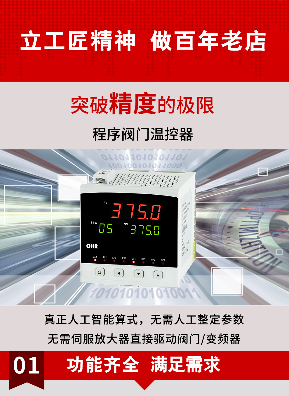 OHR-E401系列程序閥門溫控器/調(diào)節(jié)儀采用真正的人工智能算式,儀表啟動自整定功能,可以根據(jù)被控對象的特性,自動尋找最優(yōu)參數(shù)以達到很好的控制效果,無需人工整定參數(shù)??販鼐然具_±0.1℃,無超調(diào)、欠調(diào),達國際先進水平。