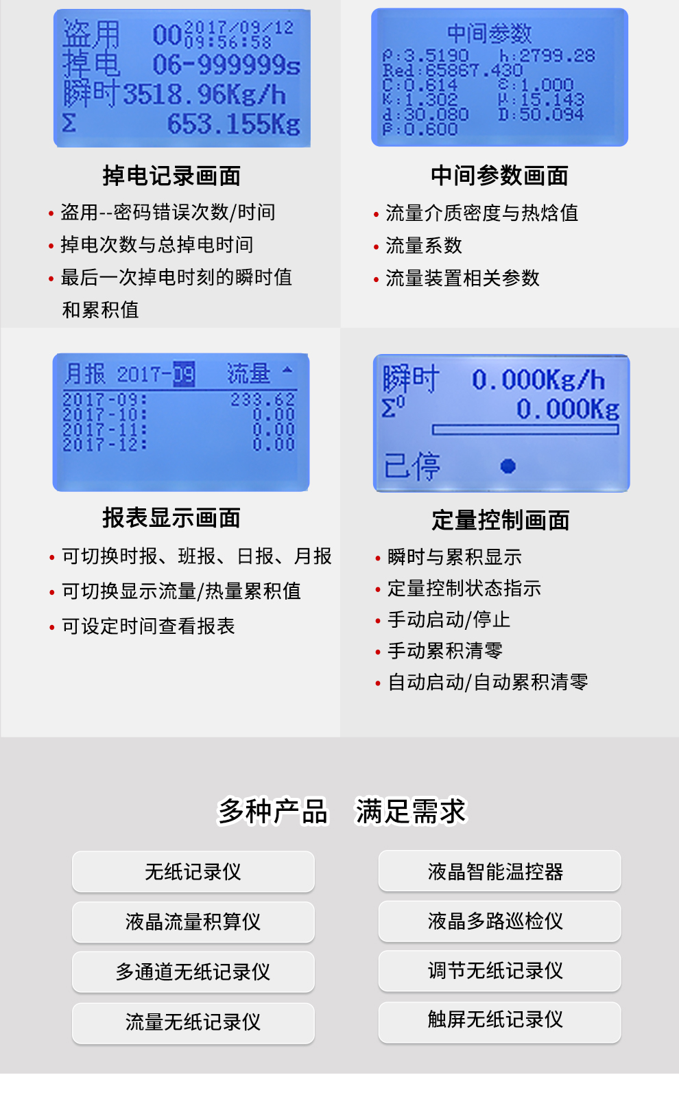 無紙記錄儀 液晶無紙記錄儀 液晶智能溫控器 液晶手動操作器 液晶流量積算儀 液晶容積記錄儀 液晶天然氣積算儀 液晶多路巡檢儀 導(dǎo)軌無紙記錄儀 導(dǎo)軌流量積算儀 導(dǎo)軌多路溫控器 彩色無紙記錄儀 彩色調(diào)節(jié)無紙記錄儀 彩色流量無紙記錄儀 觸摸彩色無紙記錄儀 觸摸彩色調(diào)節(jié)無紙記錄儀 觸摸彩色流量無紙記錄儀 觸摸屏數(shù)顯表 觸摸屏流量儀 觸摸屏溫控器