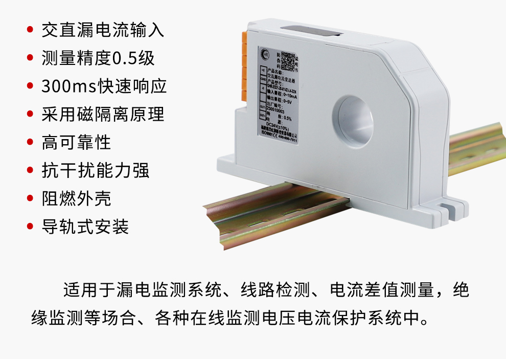 OHR-ES30系列交流/直流漏電流變送器對(duì)電網(wǎng)和電路中的交直流電流信號(hào)進(jìn)行實(shí)時(shí)測(cè)量,具有高精度、高隔離、 低漂移、低功耗、體積小、響應(yīng)快、抗干擾能力強(qiáng)等特點(diǎn)。本產(chǎn)品采用標(biāo)準(zhǔn)DIN35mm導(dǎo)軌安裝,端子接線,安裝方 便,適用于測(cè)量漏電監(jiān)測(cè)系統(tǒng),線路檢測(cè),電流差值測(cè)量,絕緣監(jiān)測(cè)等場合。