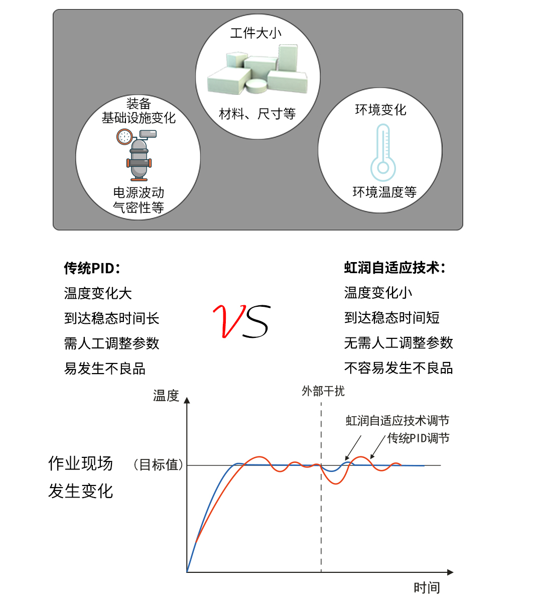 虹潤公司是專業(yè)生產(chǎn)溫控器的國家專精特新“小巨人”企業(yè)。生產(chǎn)的人工智能溫控器,具有真正人工智能算式,無需人工整定參數(shù),控制精度可達±0.1°C,多種輸出類型,高抗干擾等特點。產(chǎn)品獲得模糊PID控制儀及控制方法、人工智能調(diào)節(jié)器、智能化控制器、移相觸發(fā)控制器、閥門自動手動無擾動操作控制方法及裝置等5項國家發(fā)明專利,主持起草工業(yè)過程控制系統(tǒng)用模擬輸入兩位或多位輸出儀表、物聯(lián)網(wǎng)智能溫度儀表通用技術條件、工業(yè)過程測量和控制系統(tǒng)用智能調(diào)節(jié)器等3項國家標準,以及通信系統(tǒng)多通道數(shù)據(jù)采集控制終端規(guī)范軍用標準,參與國際5G標準制定,取得模糊PID溫控儀等3項相關軟件著作權。產(chǎn)品廣泛應用于電力、石化,冶金、制藥、食品等幾乎所有工業(yè)現(xiàn)場,實現(xiàn)精準控溫,保障生產(chǎn)安全與質(zhì)量。