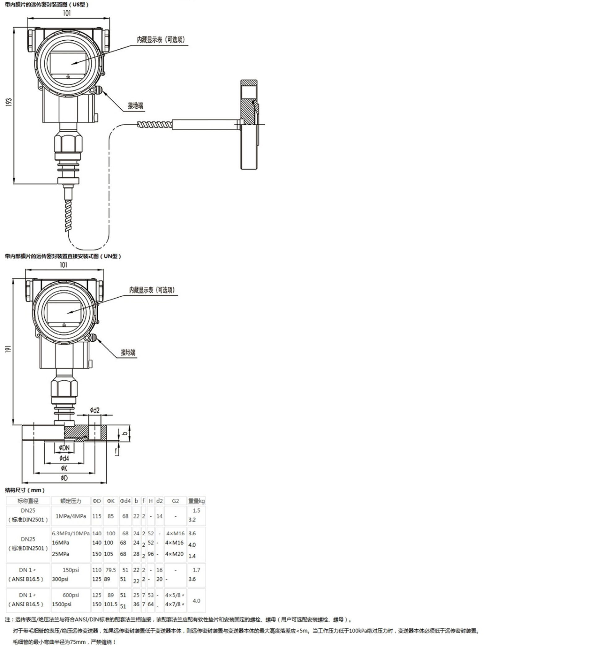 該產品用于測量液體、氣體或蒸汽的液位、密度、壓力,將其轉變成4~20mA (HART)電流輸出信號,可通過RST375手持終端對它們進行參數設定、過程監(jiān)控等。測量范圍(未遷移時)為0-6kPa~25MPa,液位法蘭的額定壓力分別為:1.6/4MPa、6.4MPa、10MPa、150psi、300psi或600psi。