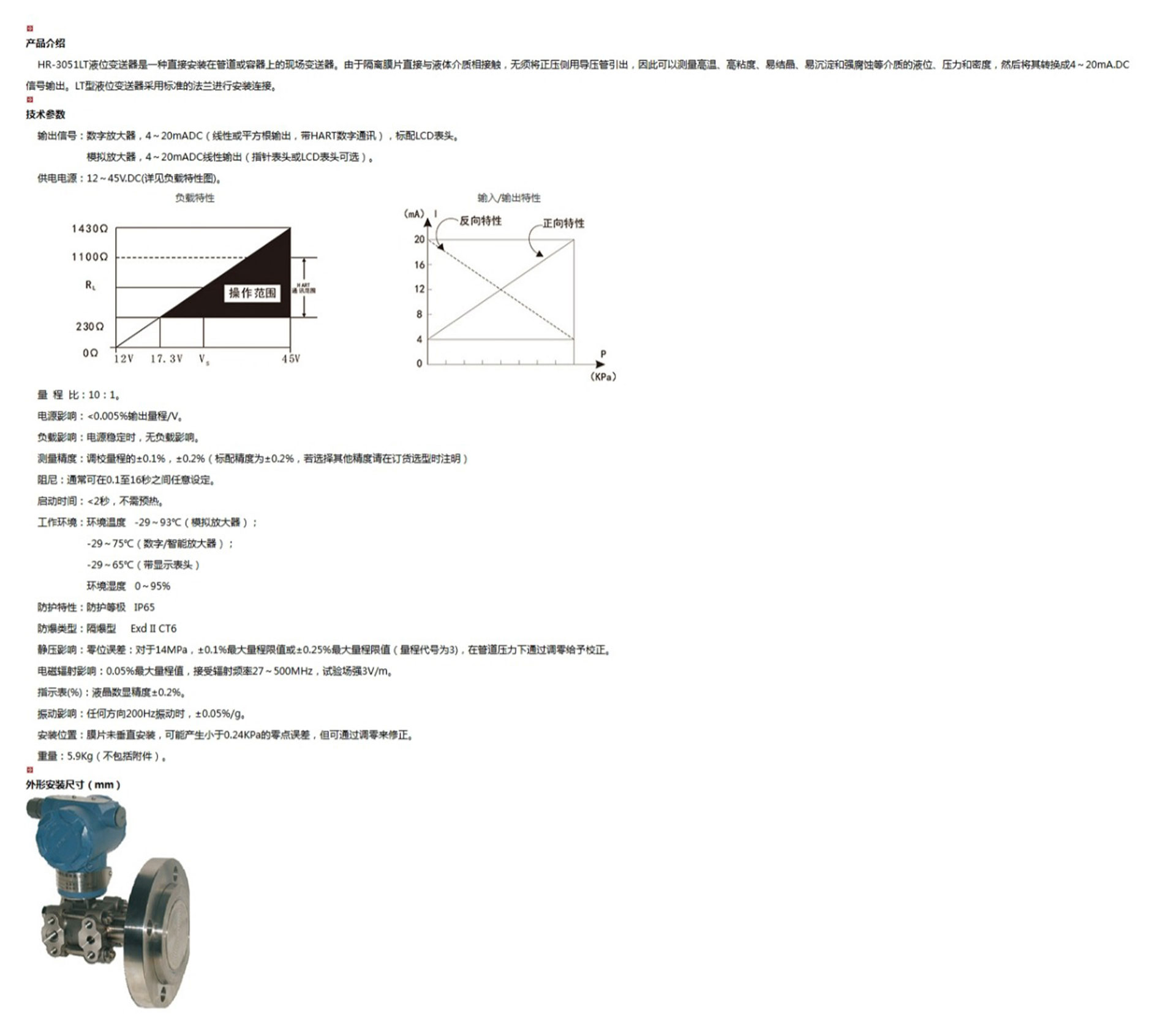 HR-3051LT液位變送器是一種直接安裝在管道或容器上的現(xiàn)場變送器。由于隔離膜片直接與液體介質(zhì)相接觸,無須將正壓側(cè)用導(dǎo)壓管引出,因此可以測量高溫、高粘度、易結(jié)晶、易沉淀和強(qiáng)腐蝕等介質(zhì)的液位、壓力和密度,然后將其轉(zhuǎn)換成4~20mA.DC信號(hào)輸出。